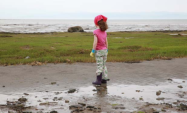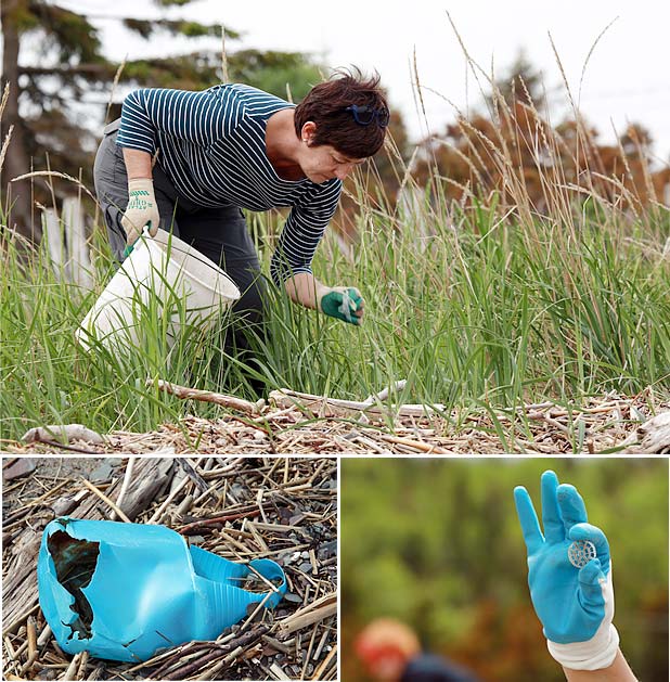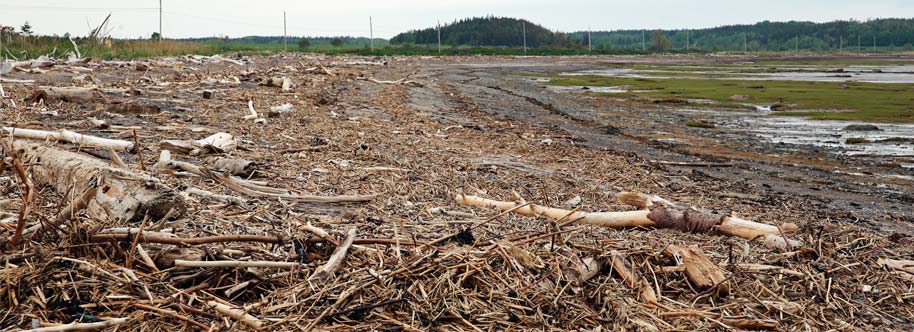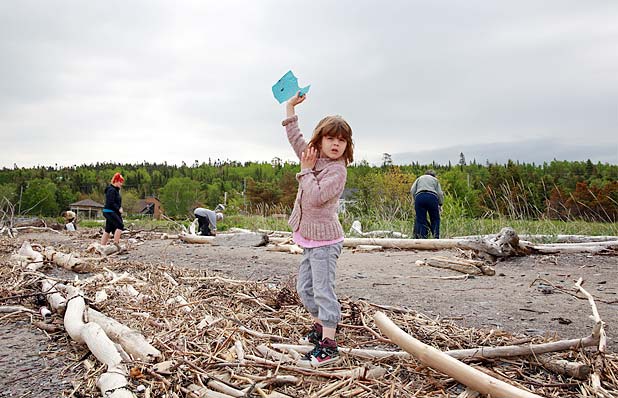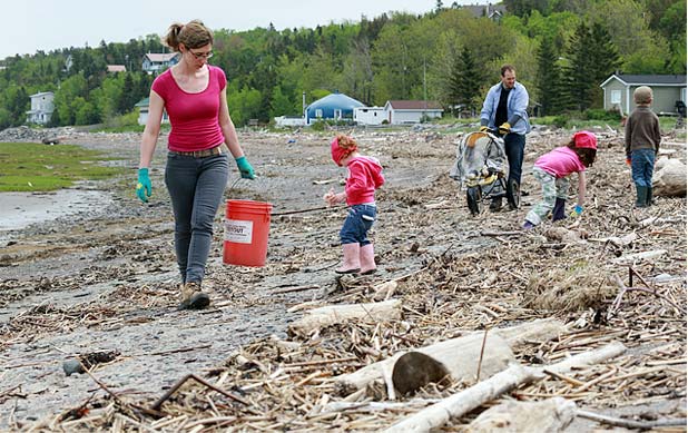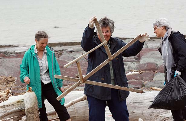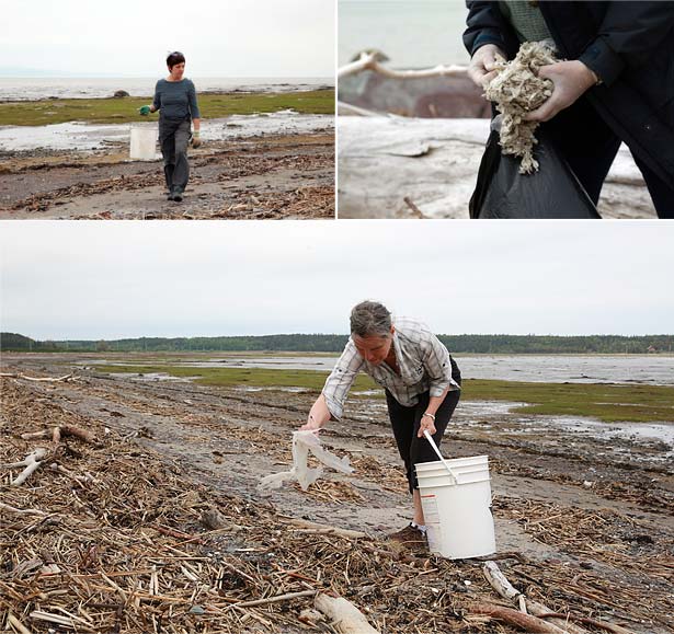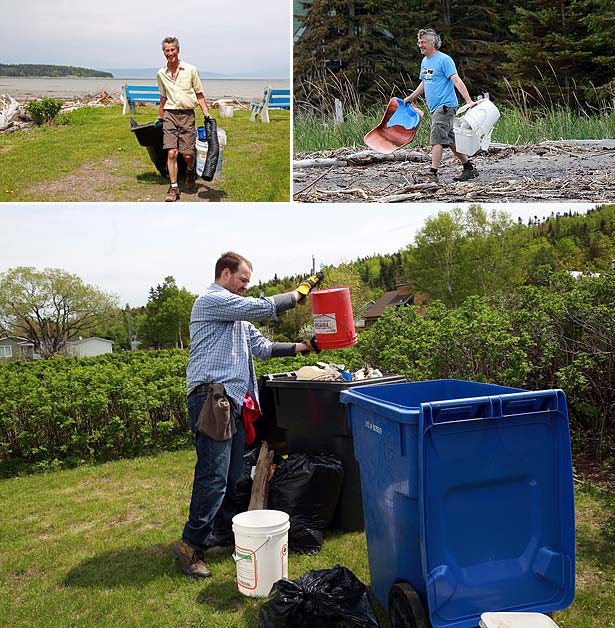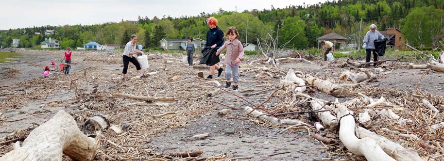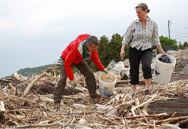 La partie ouest de la plage revêt une toute autre allure! Pratiquement pas de rochers, mais surtout des amoncellements de bois de grève dans lesquels les détritus s’entremêlent. Une mine d’or pour l’équipe! Les sacs et chaudières se remplissent à vue d’œil.