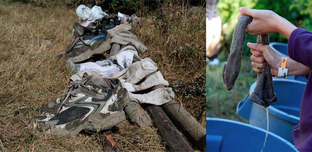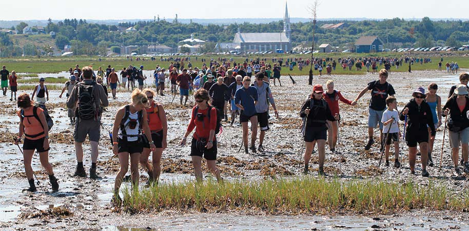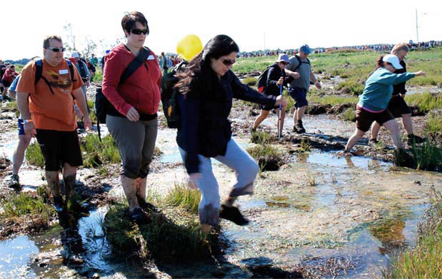 Accompagnée de plus d’une trentaine de bénévoles, la traversée se met en marche. Les premiers pas se font hésitants. La vase surprend les passants et tente d’avaler leurs jambes. Certains perdent pied et s’agrippent au bras de leur coéquipier dans l’espoir de ne pas s’enfoncer d’avantage. De légers cris entremêlés d’éclats de rire se font entendre, mais le sourire est sur le visage de tous les participants.