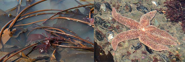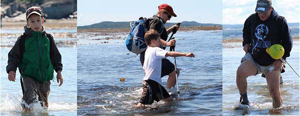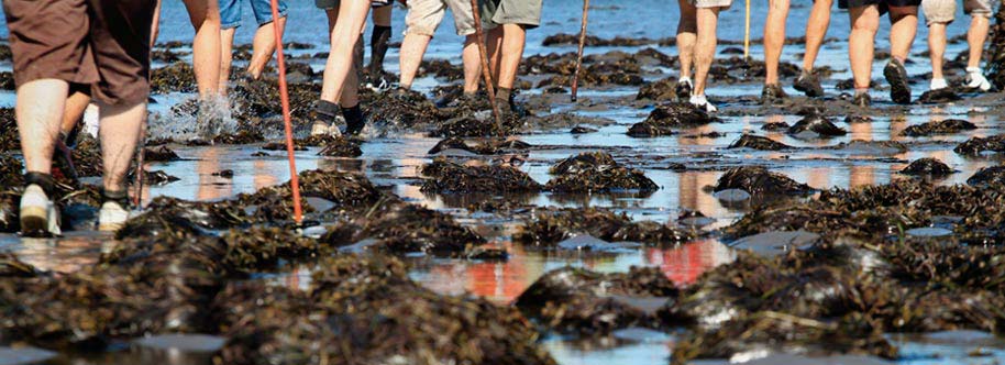 Il reste environ 2 km à franchir. Étoiles de mer, crabes des sables, moules et coquillages se laissent découvrir entre les longs laminaires qui recouvrent le fond marin. Attention, glissant!