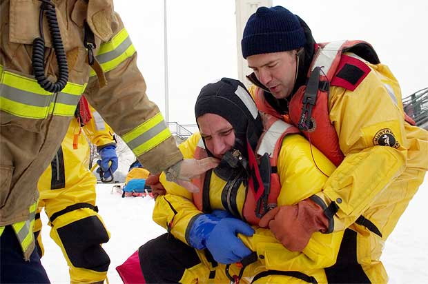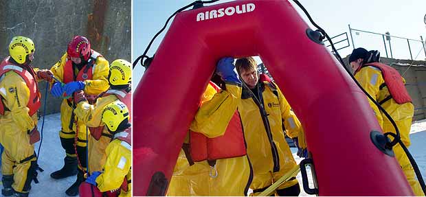 Une fois arrivée sur le lieu de la tragédie, la première étape pour les secouristes consiste à enfiler correctement la combinaison étanche qui les gardera bien au sec durant toute l’opération.