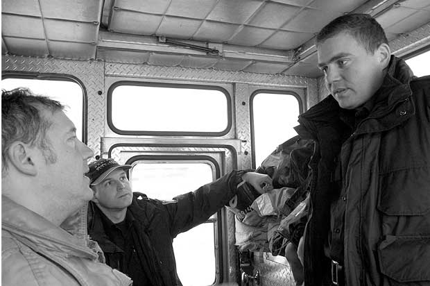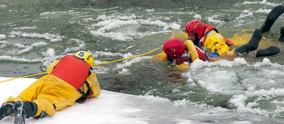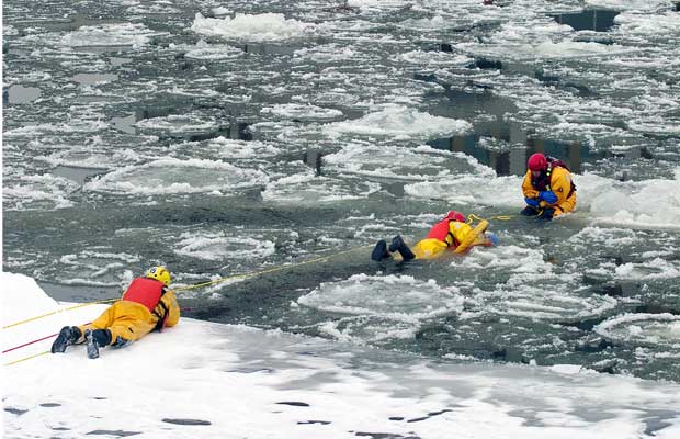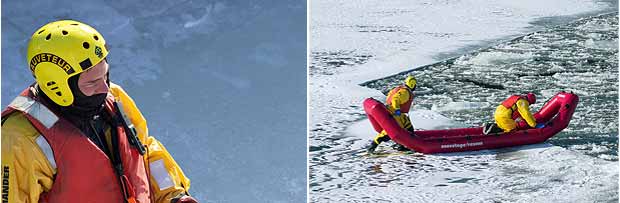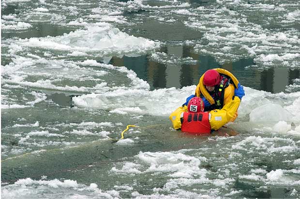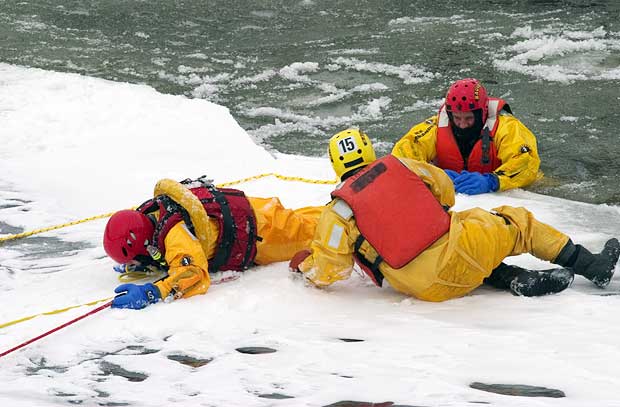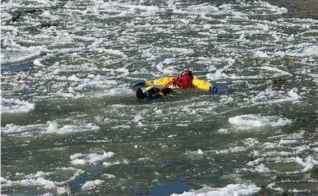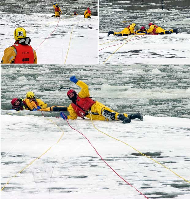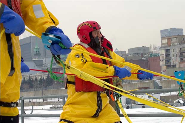 C’est maintenant au tour des secouristes restés au sol de hisser le malheureux hors des glaces. Première mission accomplie! Tour à tour, les pompiers de la caserne 15 sauteront dans les eaux glacées du fleuve St-Laurent pour se livrer à cet exercice.