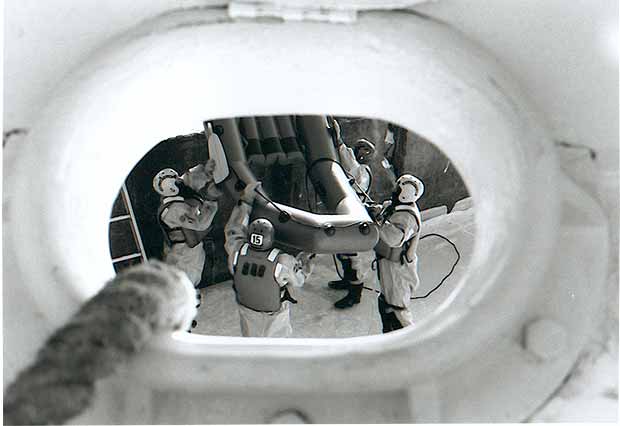 Les pompiers aident un plongeur à expulser le plus d’air possible de sa combinaison.
