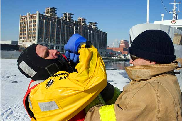 Ça y est, un premier plongeur saute dans l’eau glacée du fleuve et nage le plus rapidement possible vers la victime frigorifiée. Une fois rejoint, le pompier passe une bouée autour de la personne en péril tout en la rassurant.