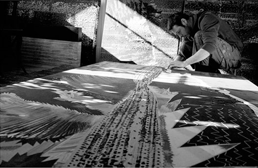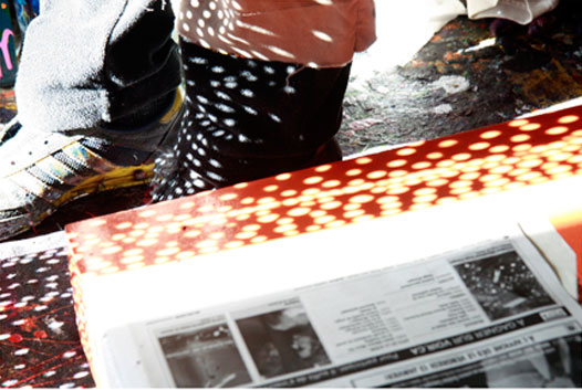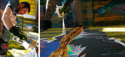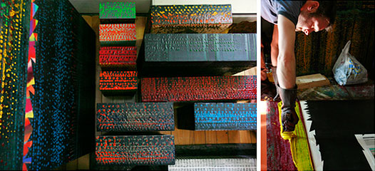 Muni de gants de caoutchouc et d’un pot de peinture industrielle jaune serein, l’artiste saute d’une surface à l’autre, sans s’arrêter. L’atelier est bientôt baigné dans un univers de points.