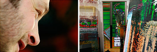 Petit à petit, les tableaux révèlent des formes bigarrées entrecoupées d’éclatants pointillés, juxtaposées à des séries de coulisses vibrantes. Mes yeux ne savent plus où se poser tellement ils sont interpellés. Bouche bée, je regarde finalement Martin.