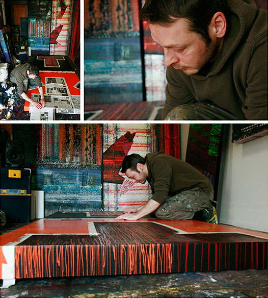 UNE CONSTELLATION DE POINTILLÉS vert lime, jaune flamboyant, bleu titane, orange vibrant disposés de façon aléatoire ou coinçés dans des zones angulaires difformes se détachent du fond noir des tableaux et laissent à peine entrevoir Martin St-Laurent. C’est que le peintre se tient devant une dizaine de grands formats alignés au mur de son atelier, telle une forteresse. Loin d’être infranchissable, Martin, tout sourire, me tend une paire de chaussures aux couleurs de ses œuvres. «Je te suggère de les mettre si tu veux ressortir d’ici sans laisser de traces…»