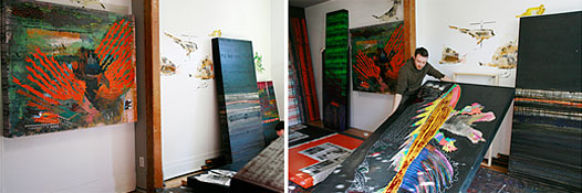 S’ensuivra une série de petites masses alignées, gorgées de peinture et remplies de récits… les pointillés. L’élément qui caractérise St-Laurent. L’artiste très concentré, lève parfois la tête pour me mettre en contact avec son imaginaire.